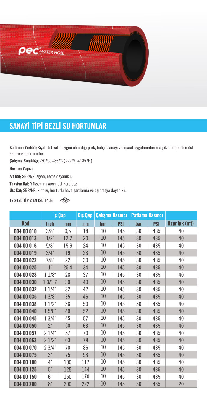 Bezli Kauçuk Hortum Kullanım Tablosu
