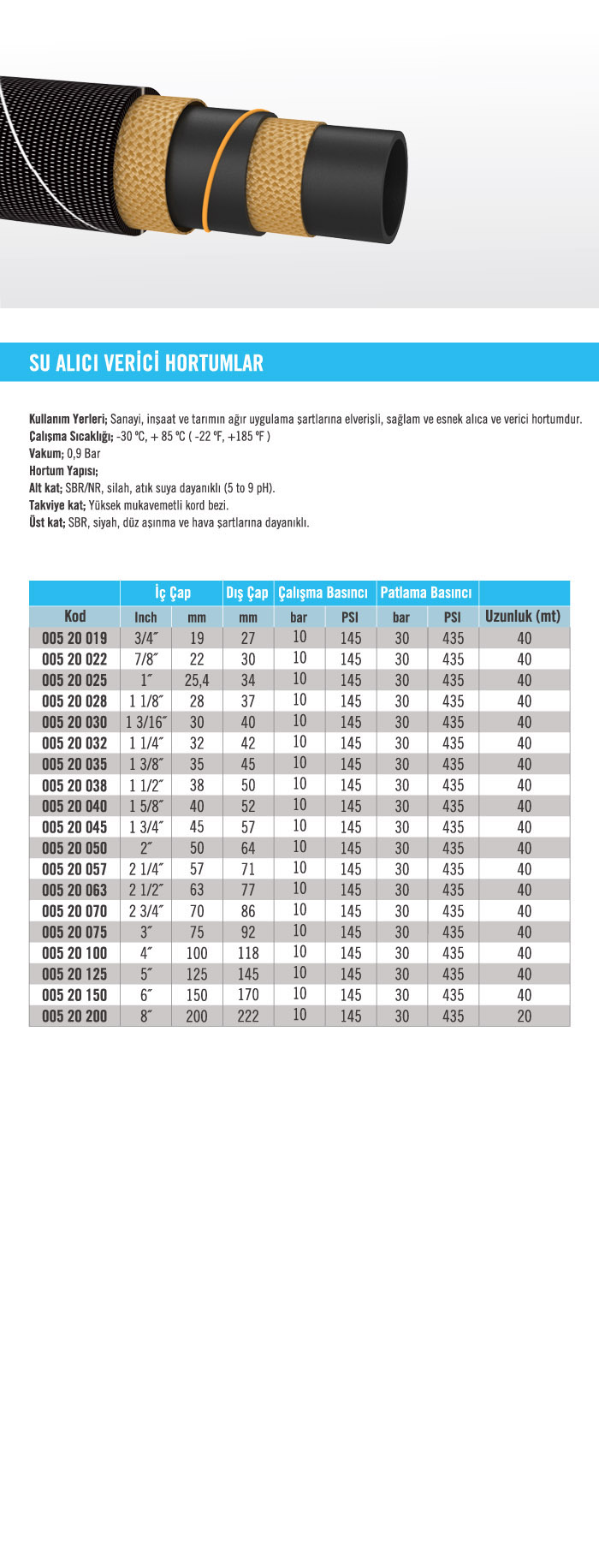Bezli Kauçuk Hortum Kullanım Tablosu