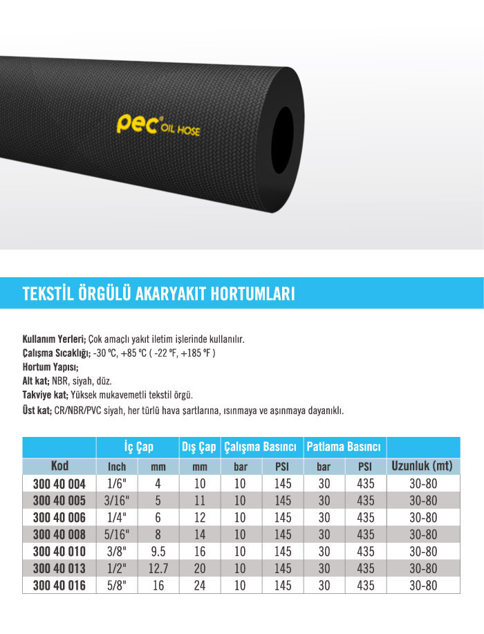 Bezli Kauçuk Hortum Kullanım Tablosu